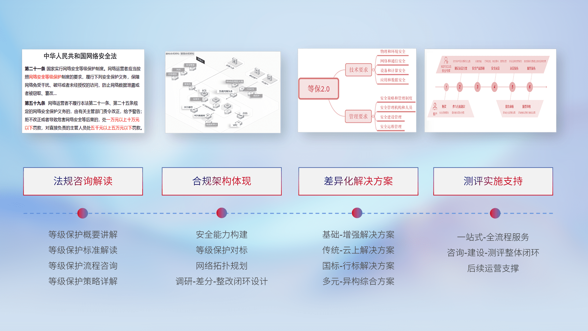 通过专业的法律咨询解读、、合规架构体现、、、差异化解决方案、、测试实施支持等服务,,,,为客户量身打造等保合规体系。。。